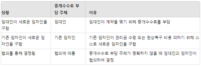 - 이유: 임대인이 새로운 임차인과 계약을 맺기 위해 진행할때, 예를 들어, 임대인이 임대료를 올리는 조건으로 임차인을 구하고자 한다면 중개수수료를 지불하겠죠.