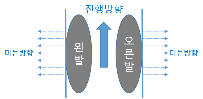그래야 오른발을 밀고 난 뒤 바로 들어서 제자리로 올 수가 있습니다.