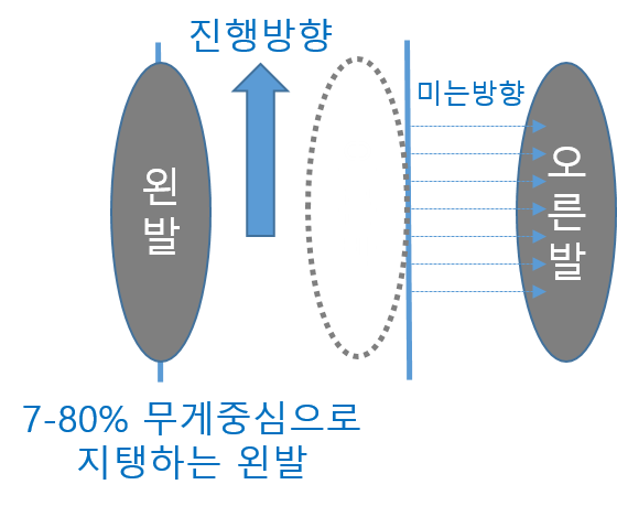 왼발을 지탱하고 오른발을 밀었다면 무게중심은 왼발에 7-80%는 실어줘야합니다.